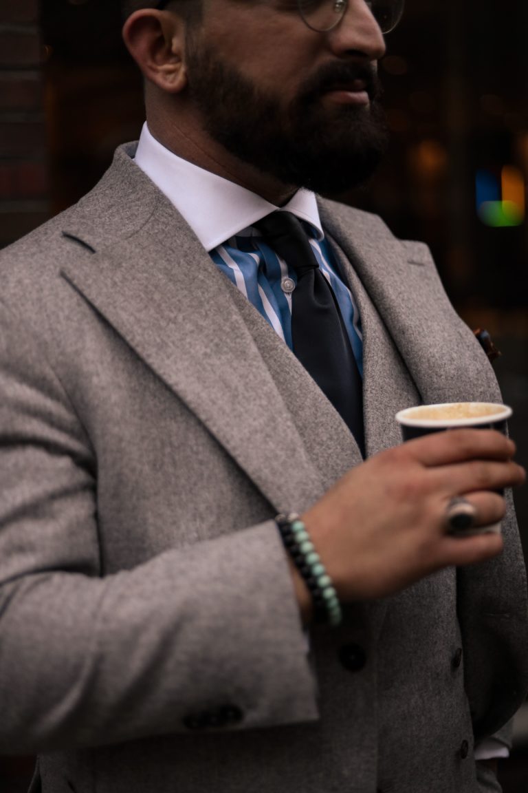 - insbesondere Männer: Ein gut sitzender Anzug oder Smoking, der die Schultern betont und an der Taille gut angepasst ist, ist vorteilhaft. Die Länge der Hose ist entscheidend und das Sakko muss passend sitzen.
