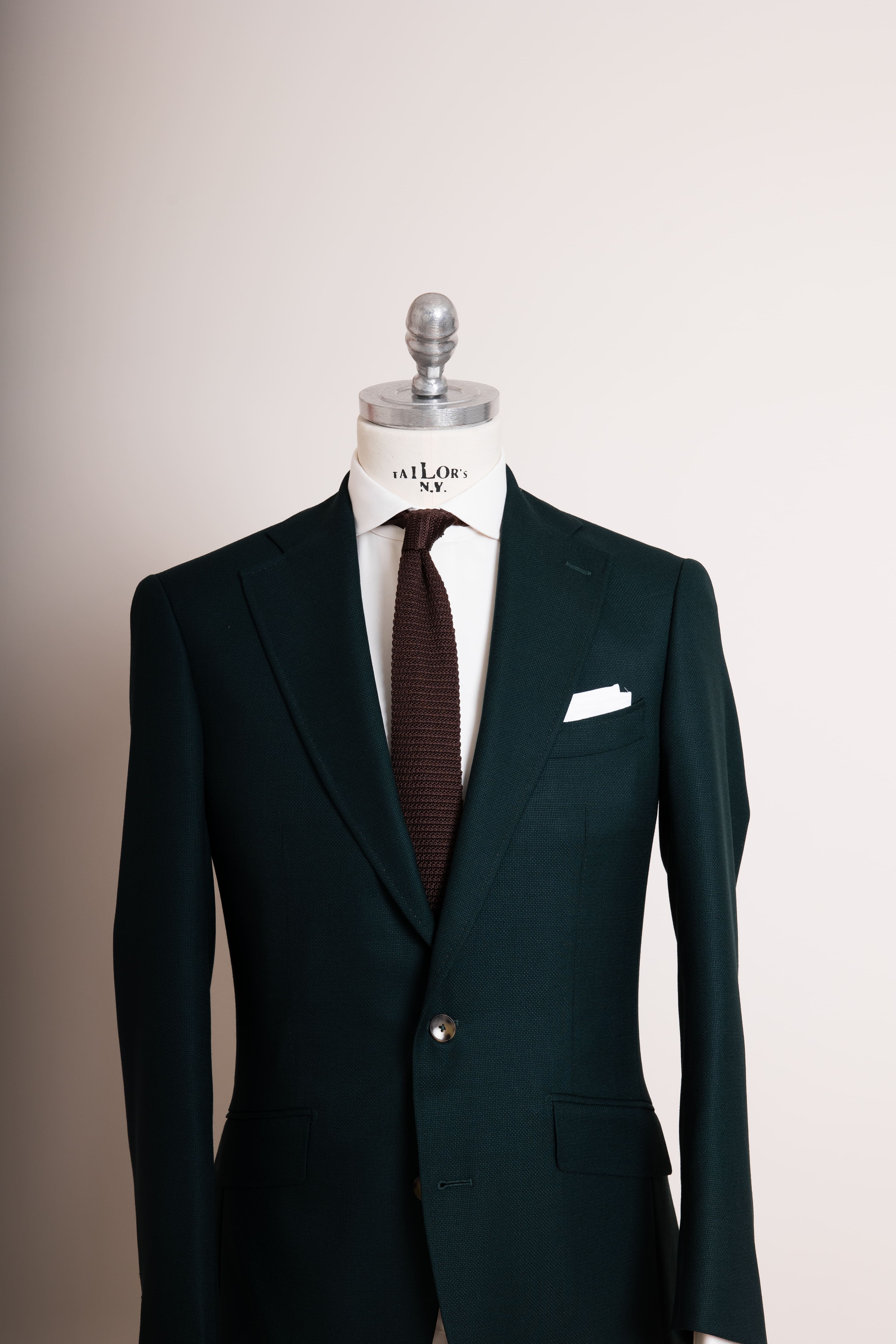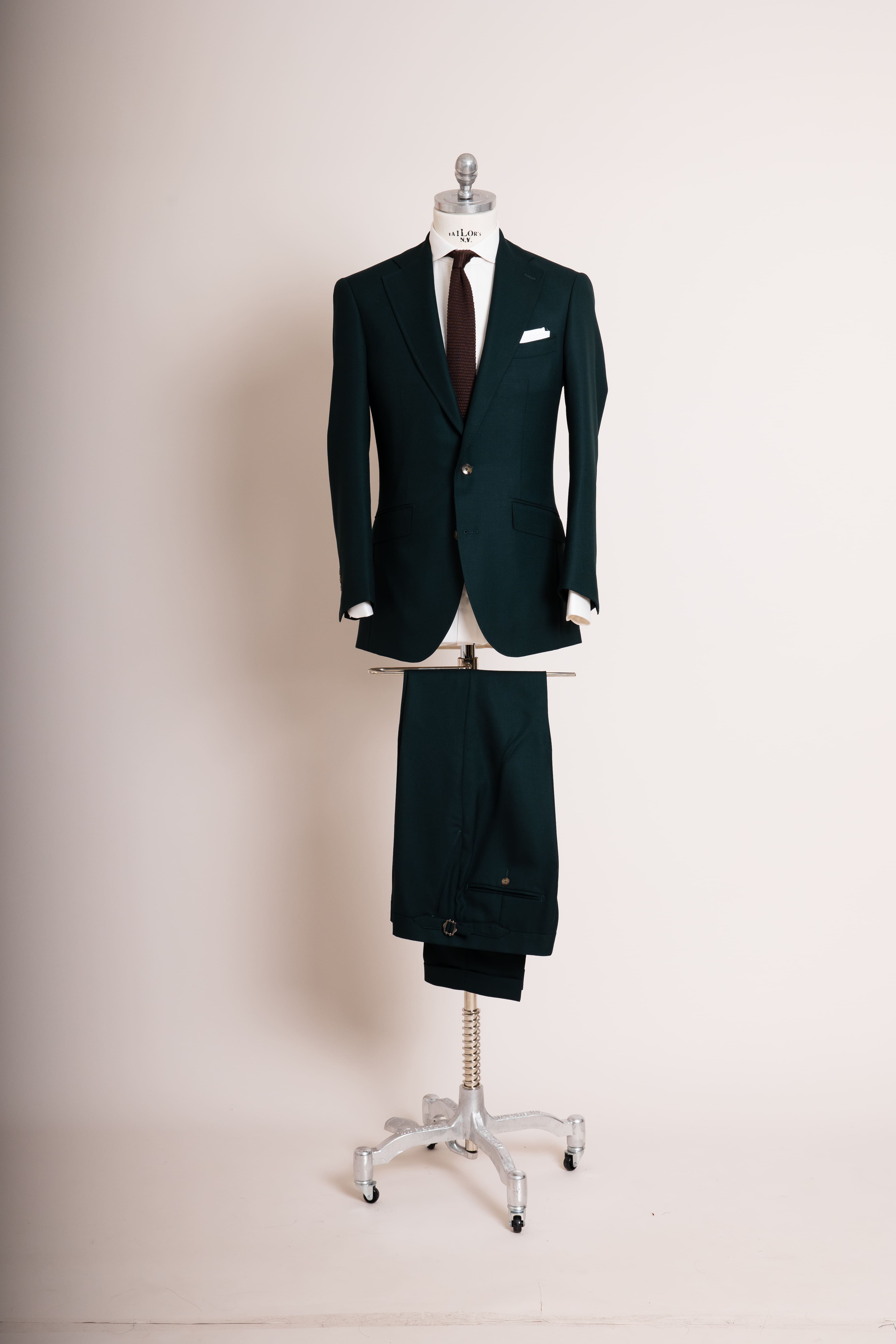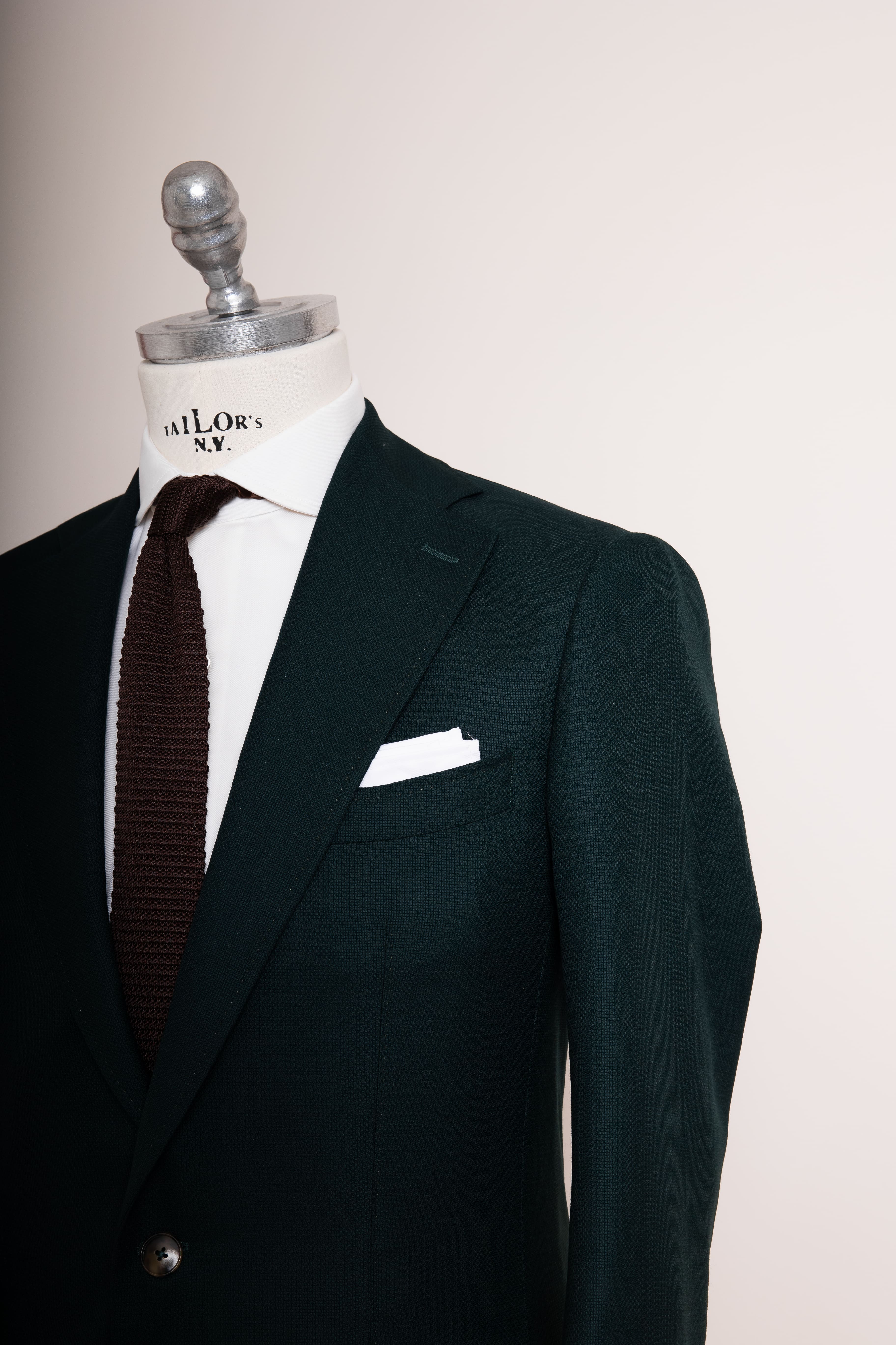 Anzug Verdant Fresco vereint sommerliche Leichtigkeit mit souveräner Eleganz: dunkelgrüne Fresco-Wolle, atmungsaktiv und formstabil. Die körnige Struktur verleiht Charakter, das satte Grün dezente Individualität. Ein Look mit stiller Autorität – strukturiert, stilvoll, souverän.