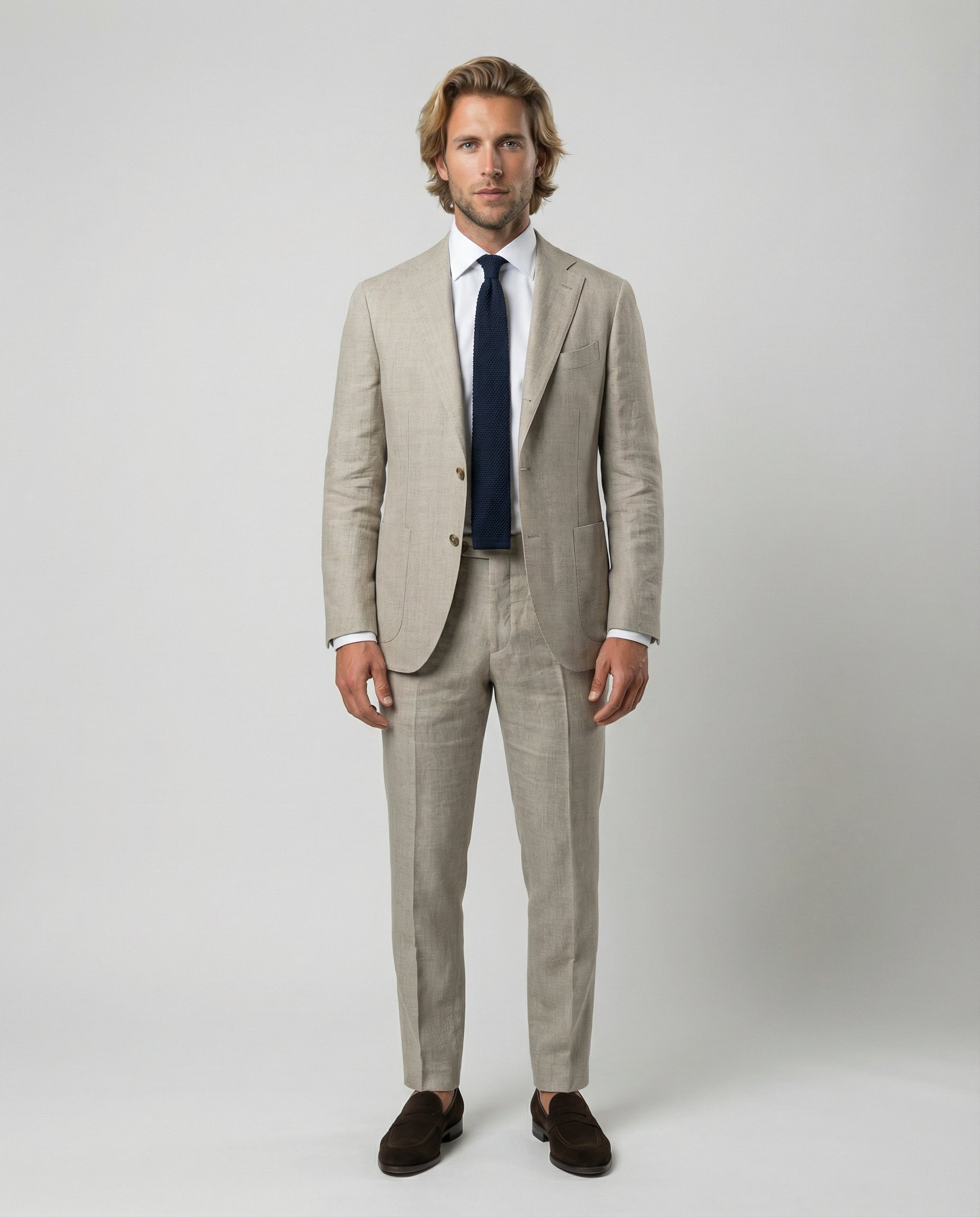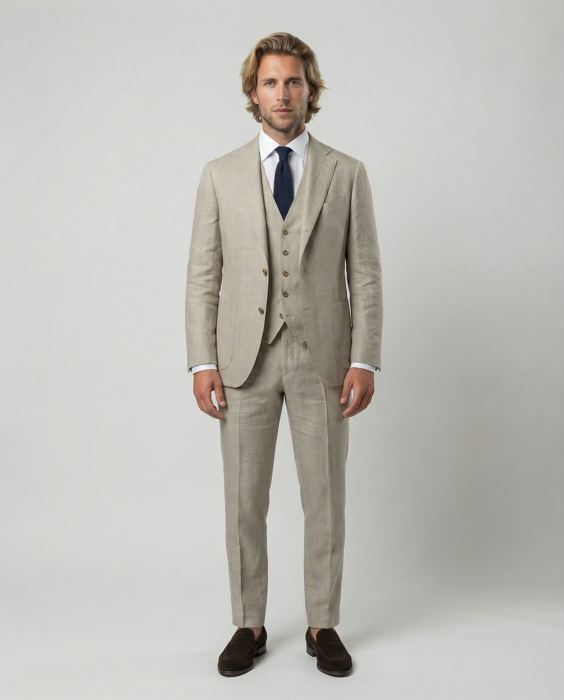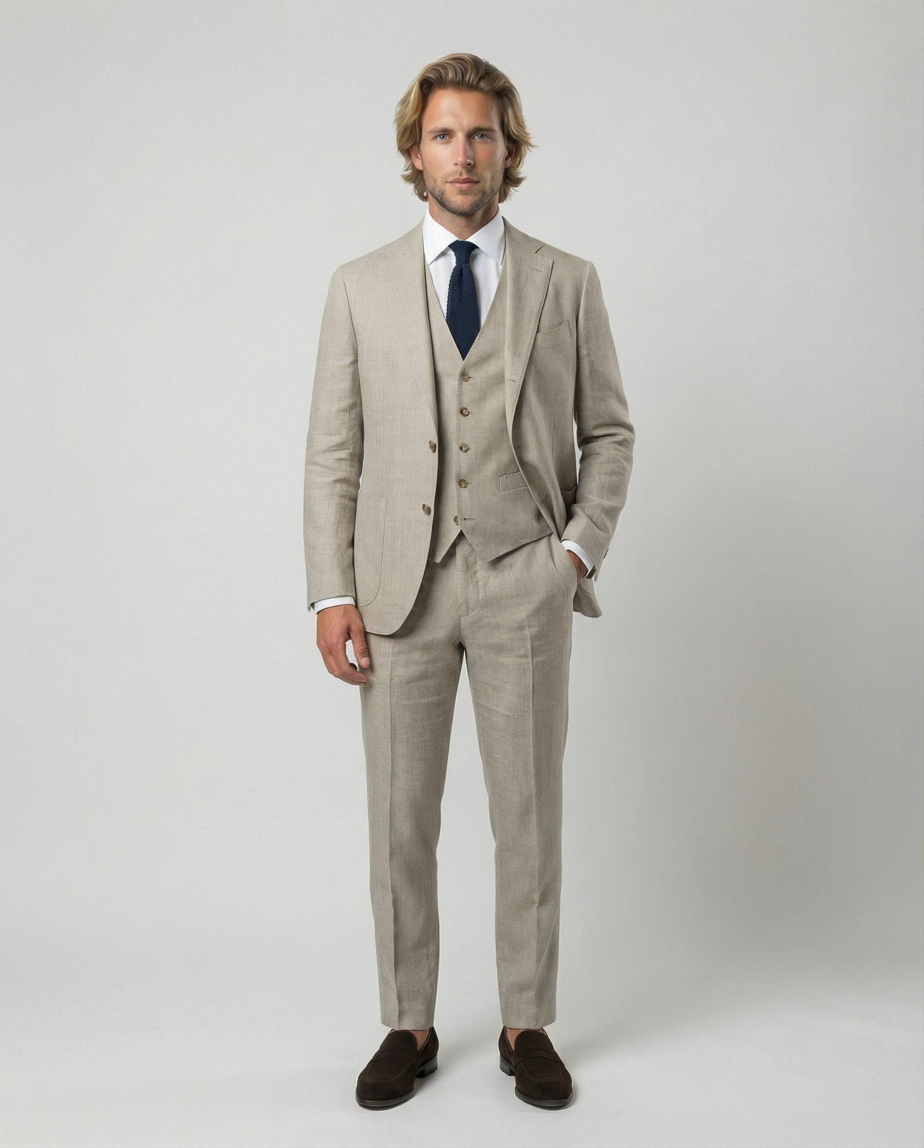 Leicht, natürlich und zeitlos modern: Unser beiger Hopsack Anzug steht für entspannte Eleganz mit sommerlicher Ausstrahlung. Die offene Webstruktur sorgt für Atmungsaktivität und eine lebendige Oberfläche – perfekt für Hochzeiten, Sommer-Events oder stilvolle Auftritte bei warmen Temperaturen.