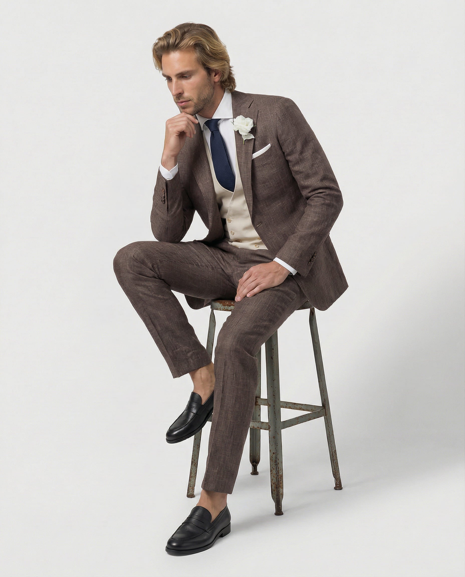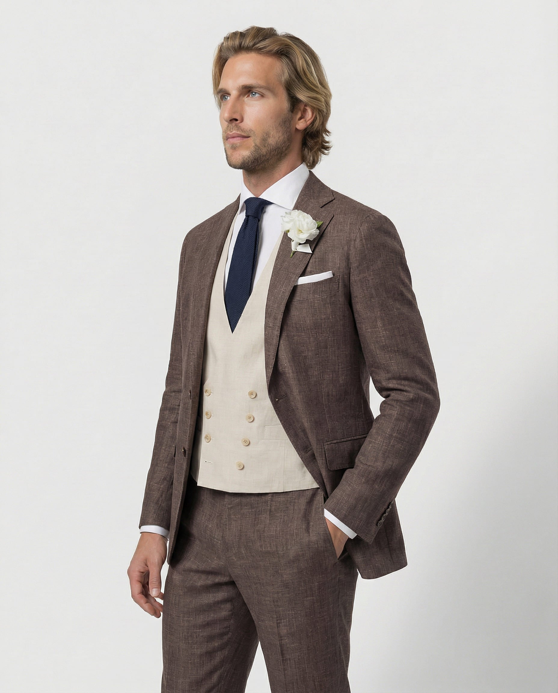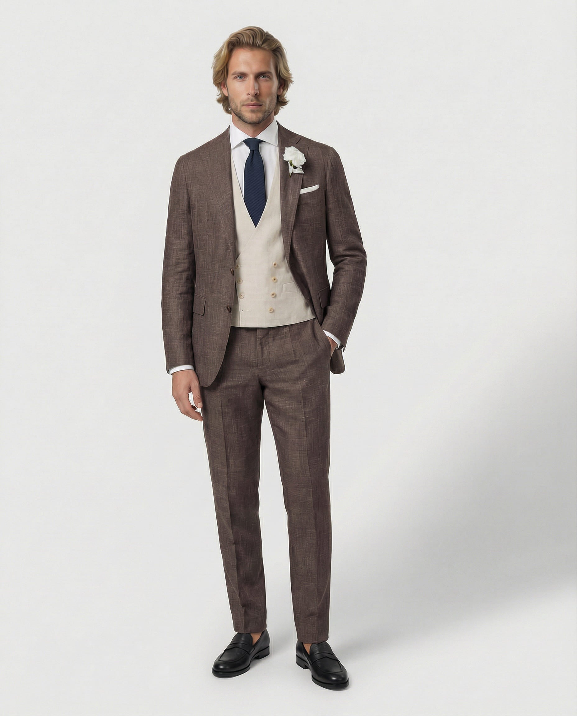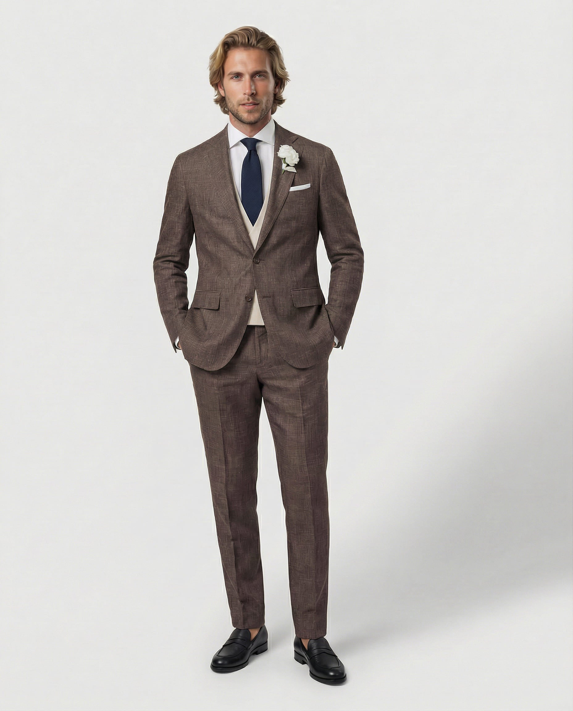 Warm, charakterstark und gemacht für besondere Tage: Unser brauner Sommeranzug aus Wolle, Seide und Leinen verbindet natürliche Tiefe mit sommerlicher Leichtigkeit. Die feine Struktur sorgt für eine lebendige Optik, die edle Materialmischung für angenehmen Tragekomfort – perfekt für Hochzeiten, Sommer-Events und stilvolle Auftritte mit Persönlichkeit.