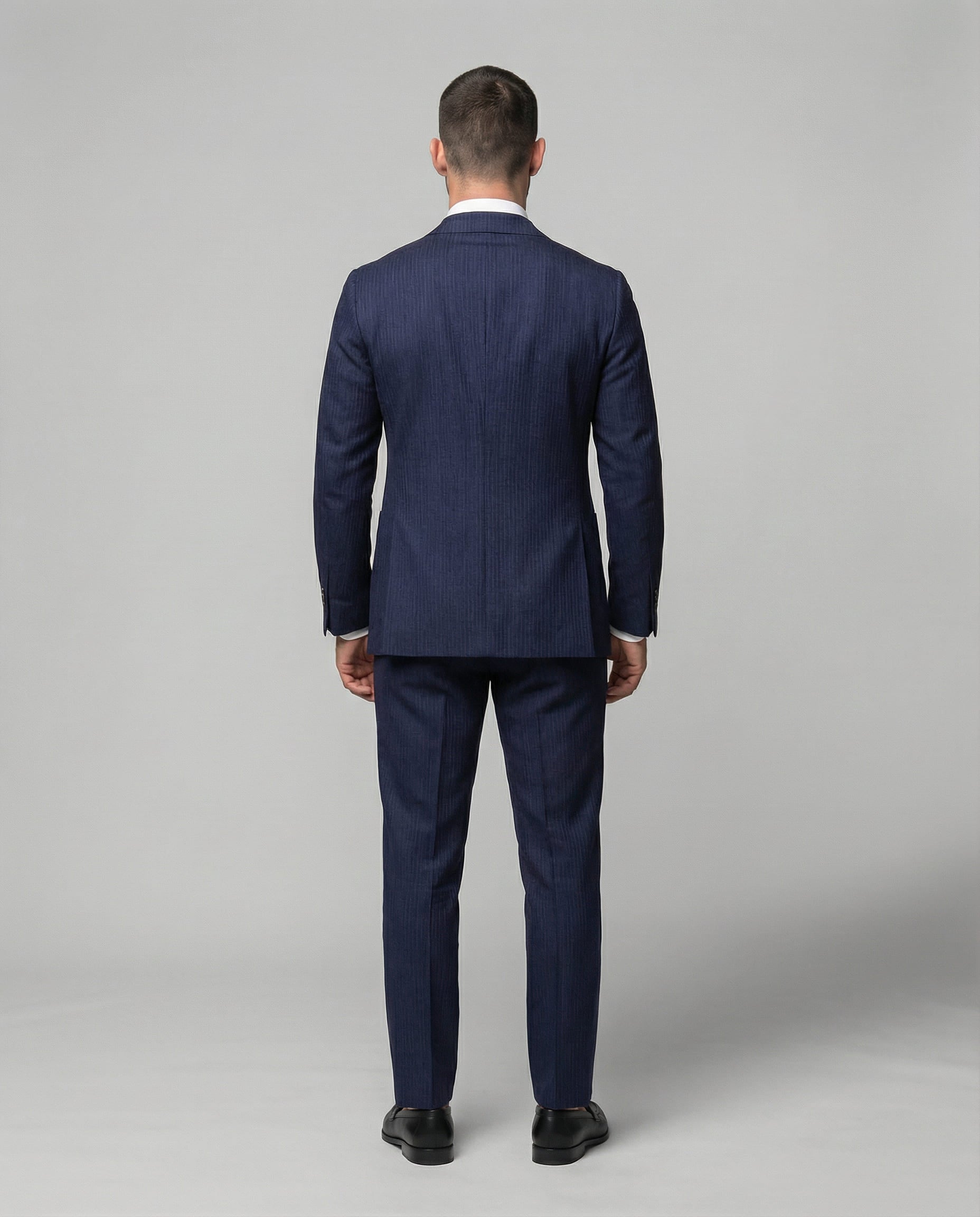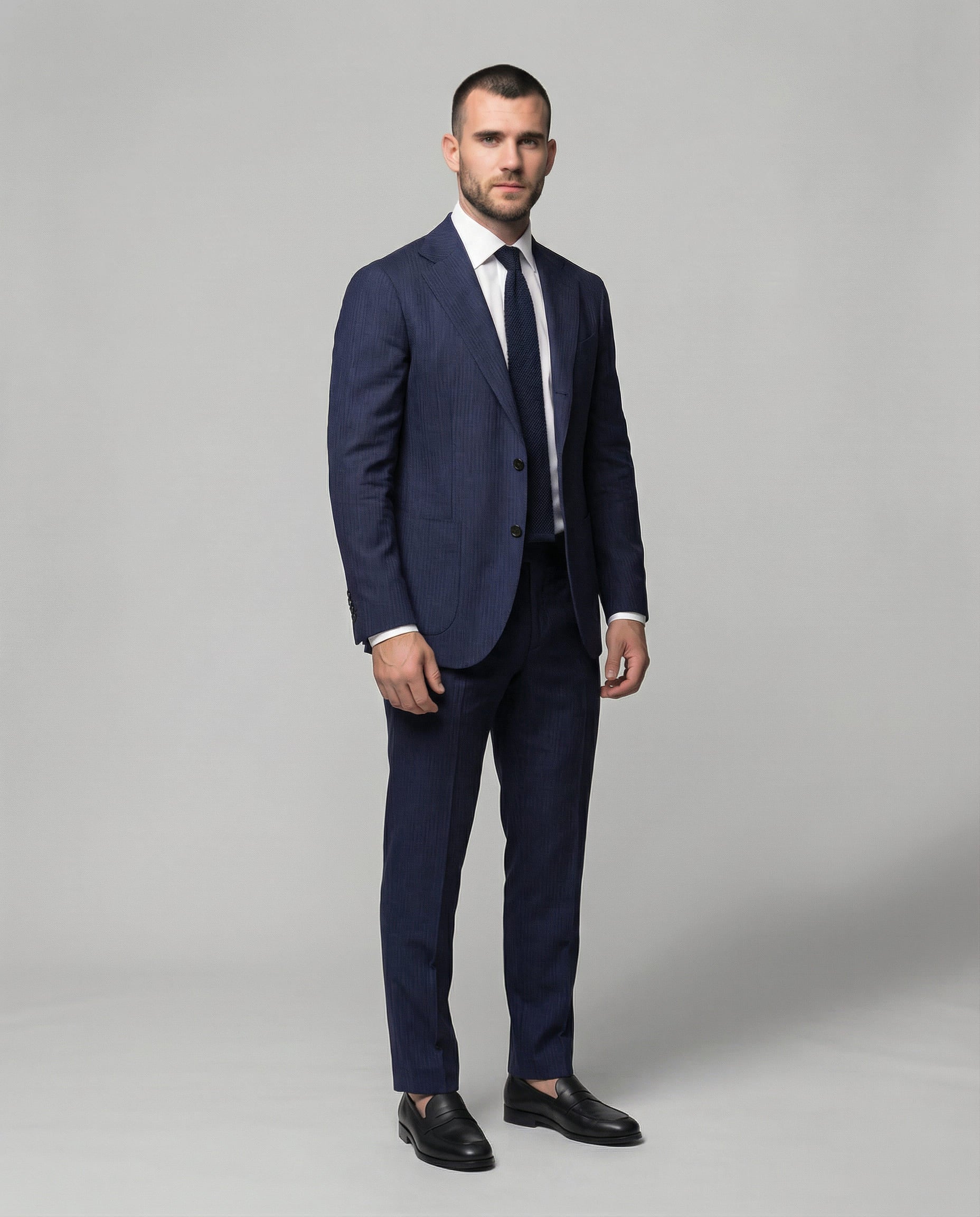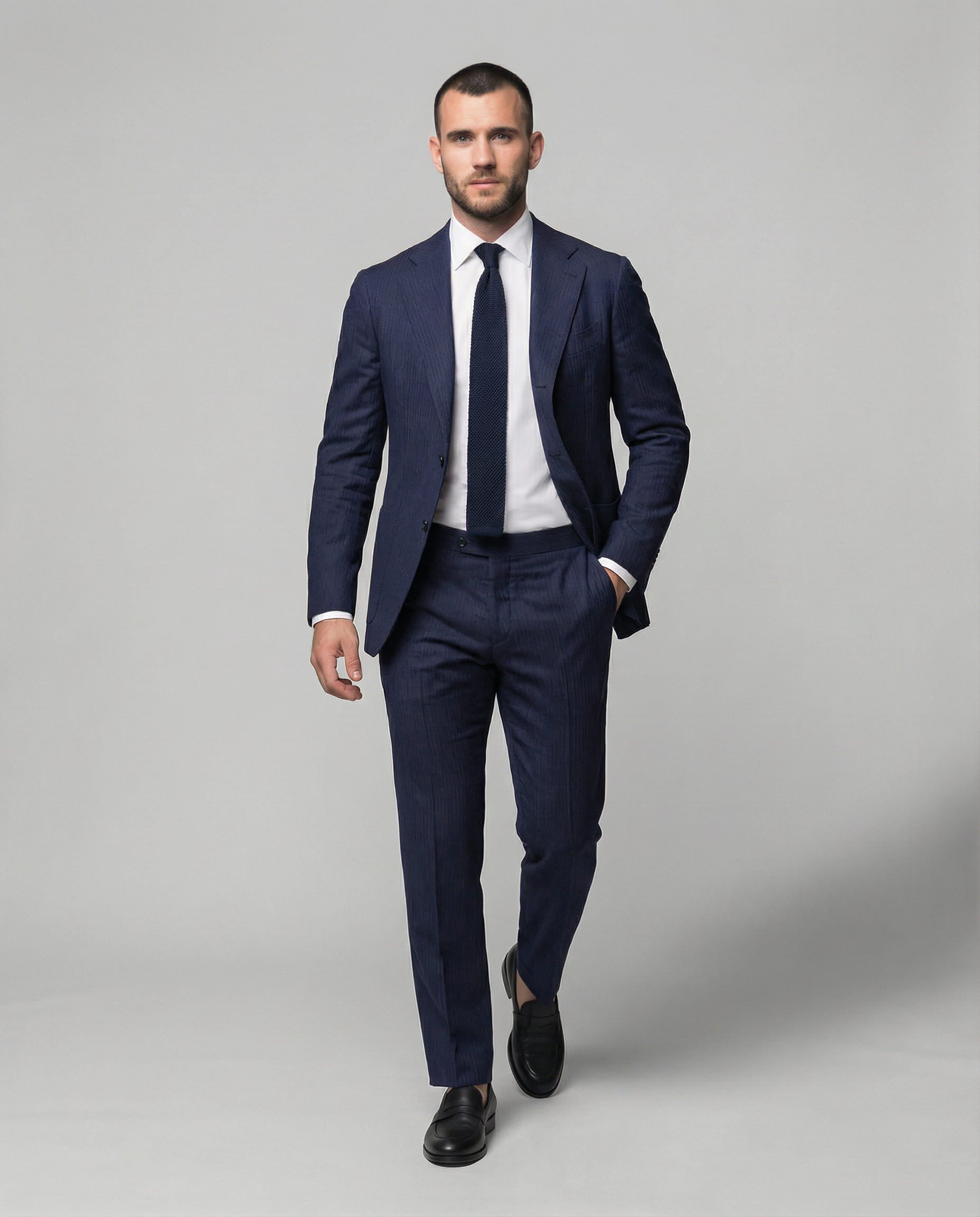 Sommerlich, strukturiert und angenehm leicht: Unser dunkelblauer Seersucker Anzug kombiniert klassische Eleganz mit maximaler Atmungsaktivität. Die typische Kräuselstruktur sorgt für Luftzirkulation und entspannten Tragekomfort – perfekt für Hochzeiten, Sommer-Events oder stilvolle Business-Termine bei warmen Temperaturen.
