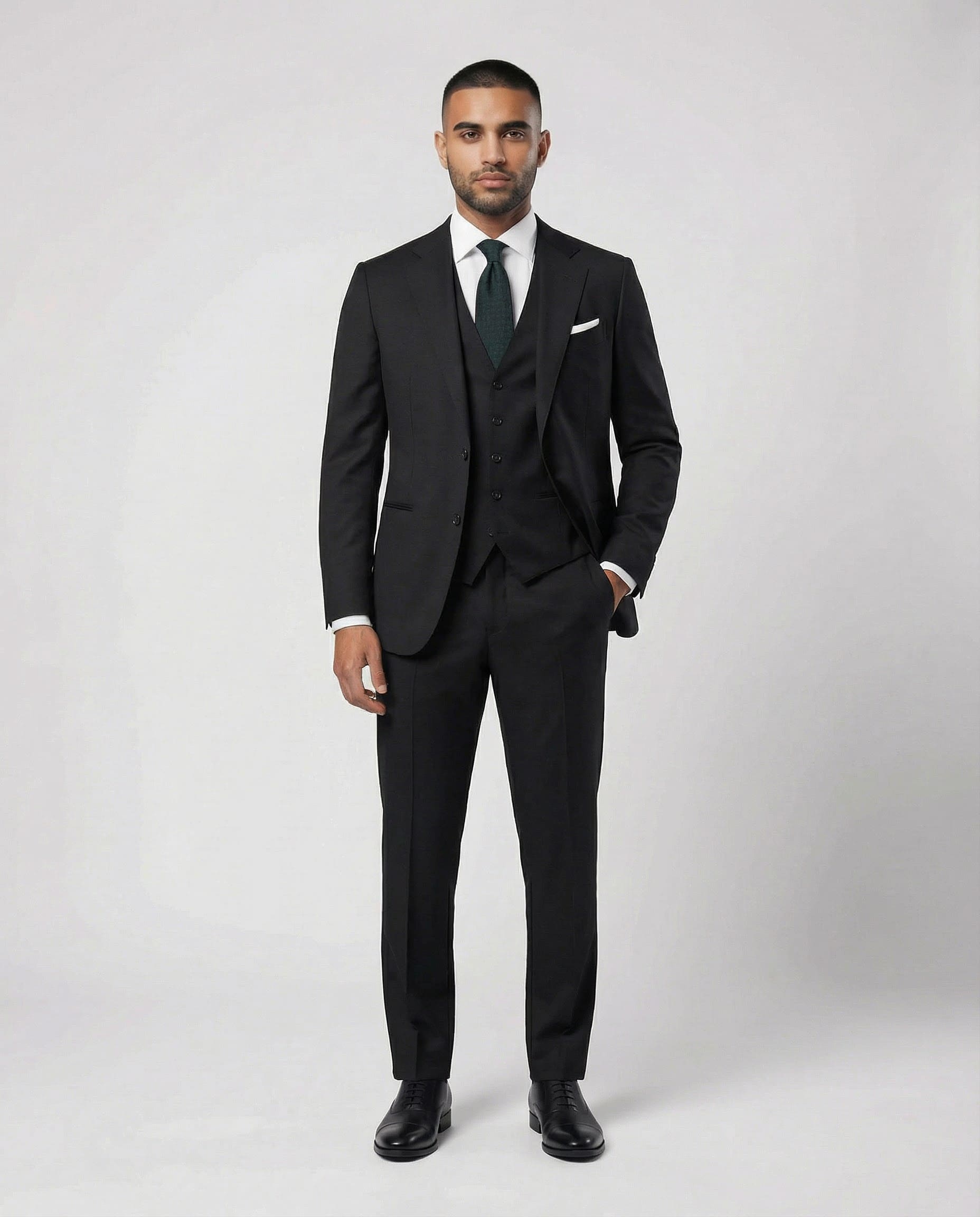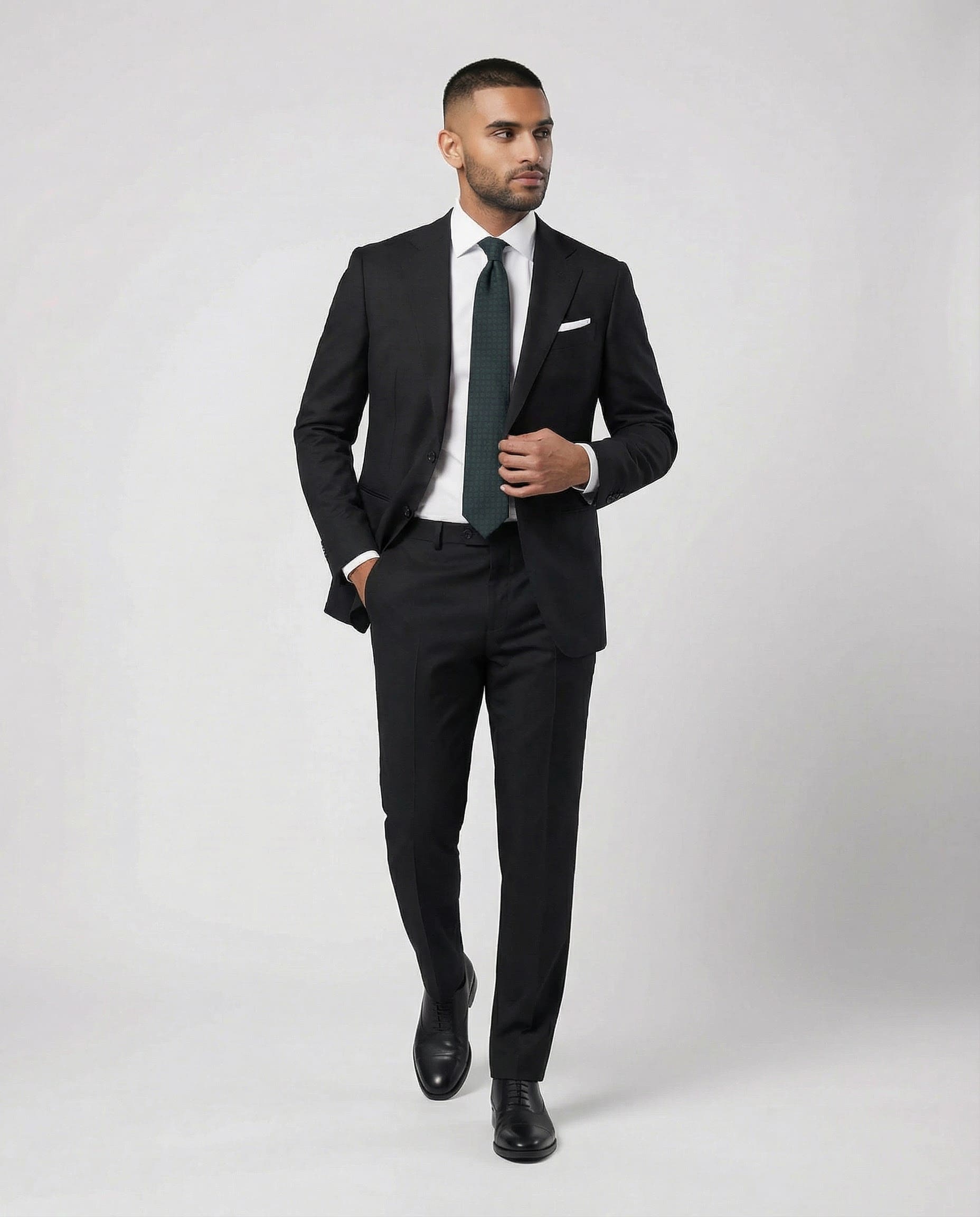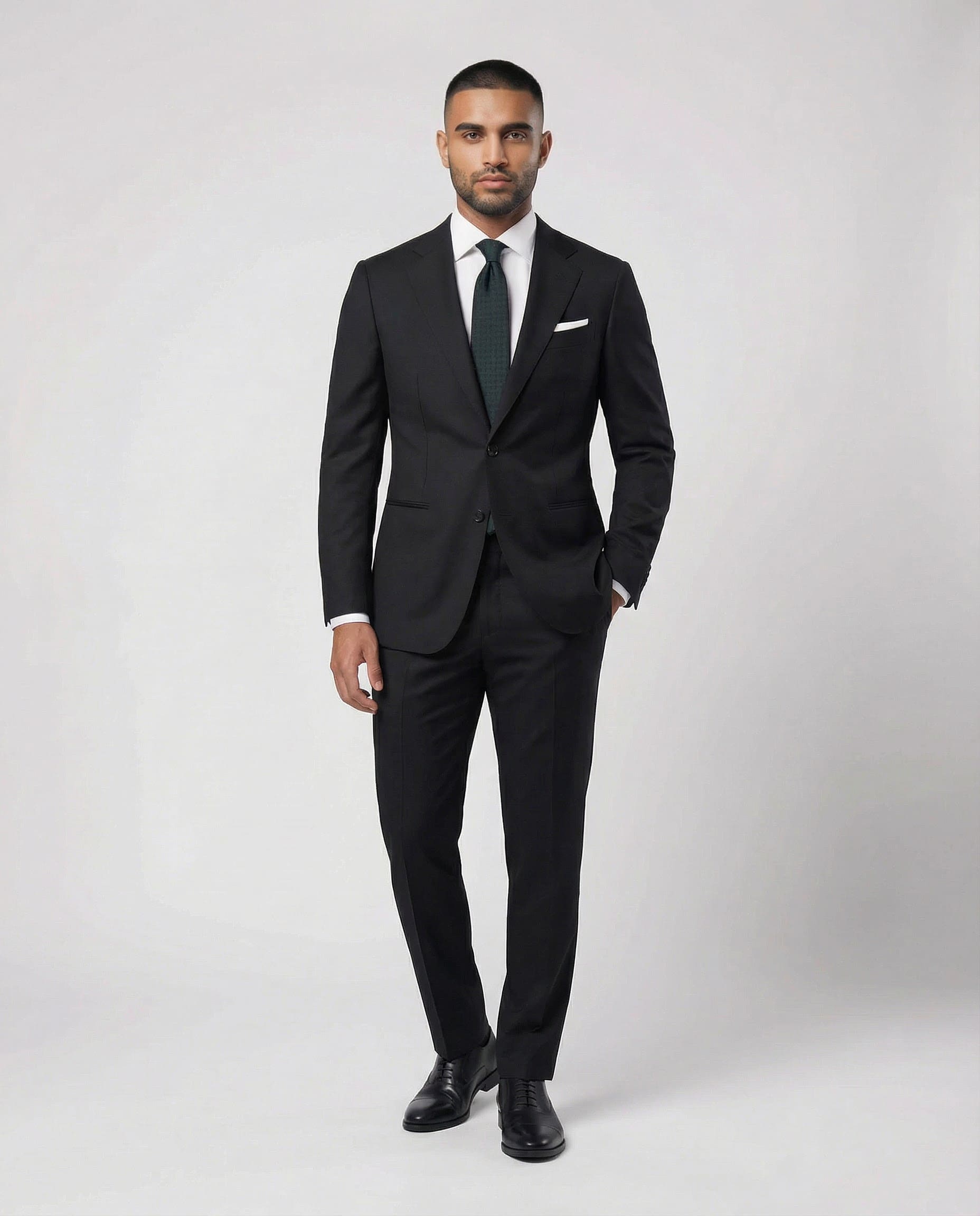 Zeitlos, klar und kompromisslos elegant: Unser schwarzer Anzug aus reiner Schurwolle Super 110s aus der 4 Seasons Kollektion steht für souveräne Vielseitigkeit. Die feine Wollqualität bietet angenehmen Tragekomfort das ganze Jahr über – ideal für Business, formelle Anlässe und stilvolle Abendmomente.
