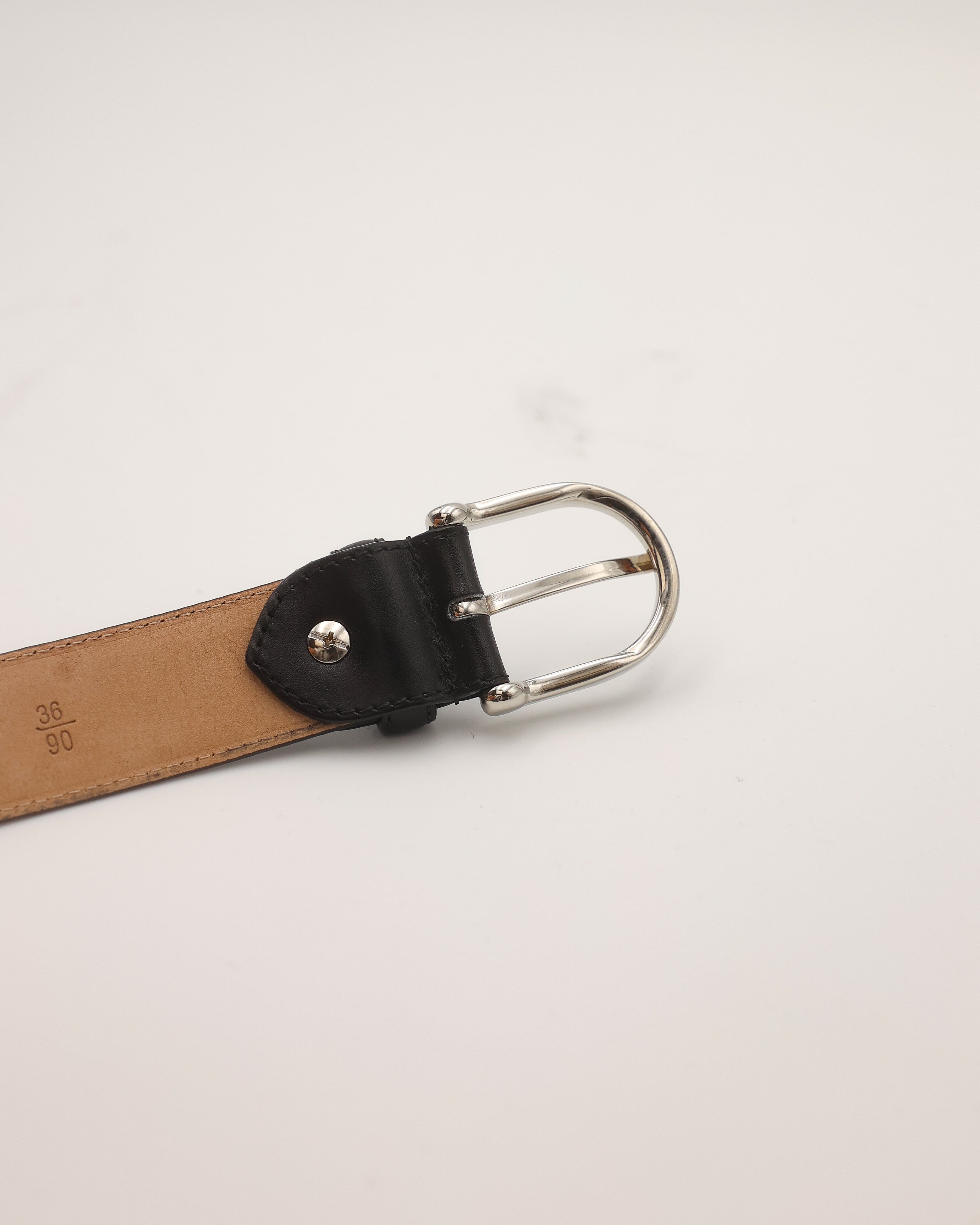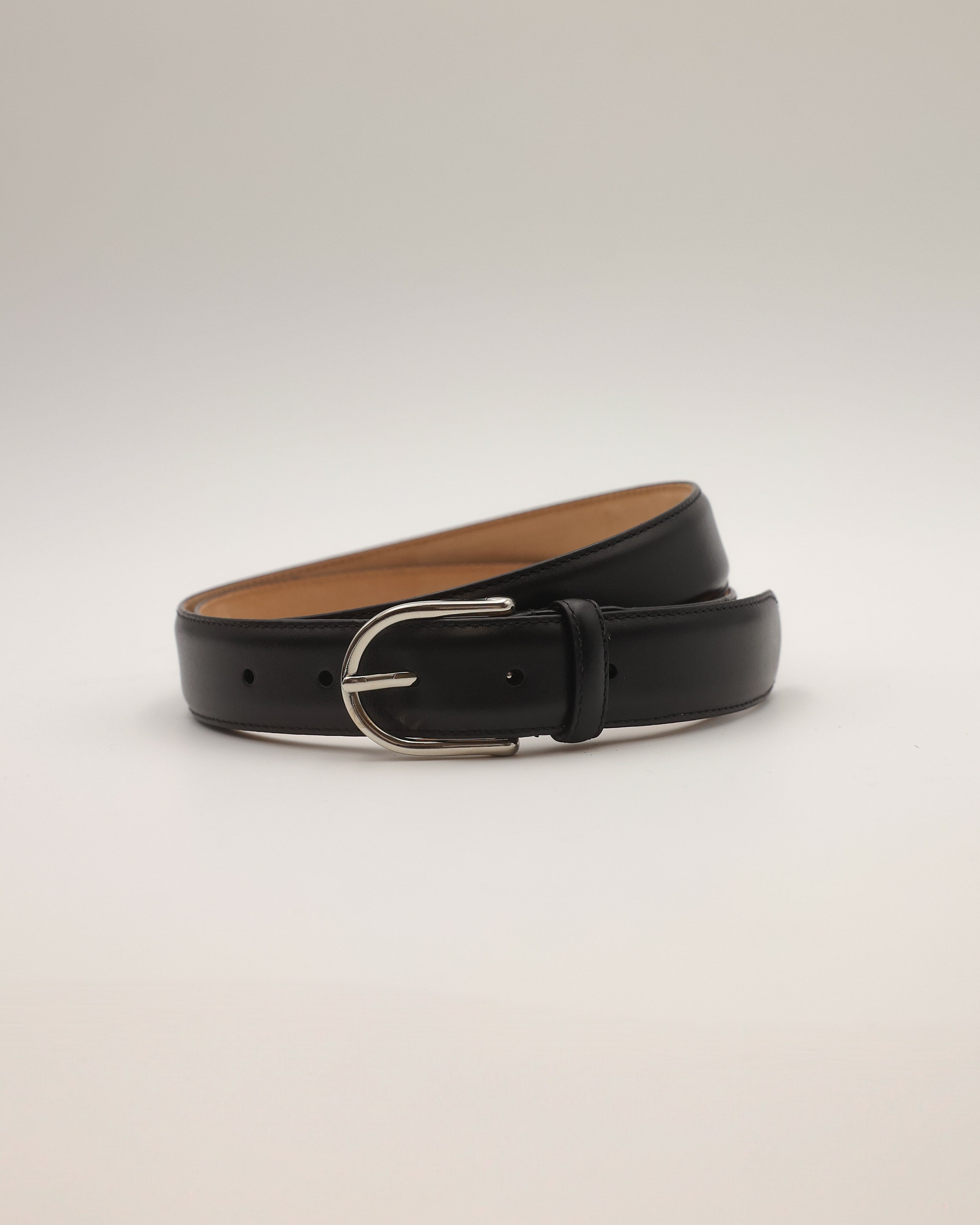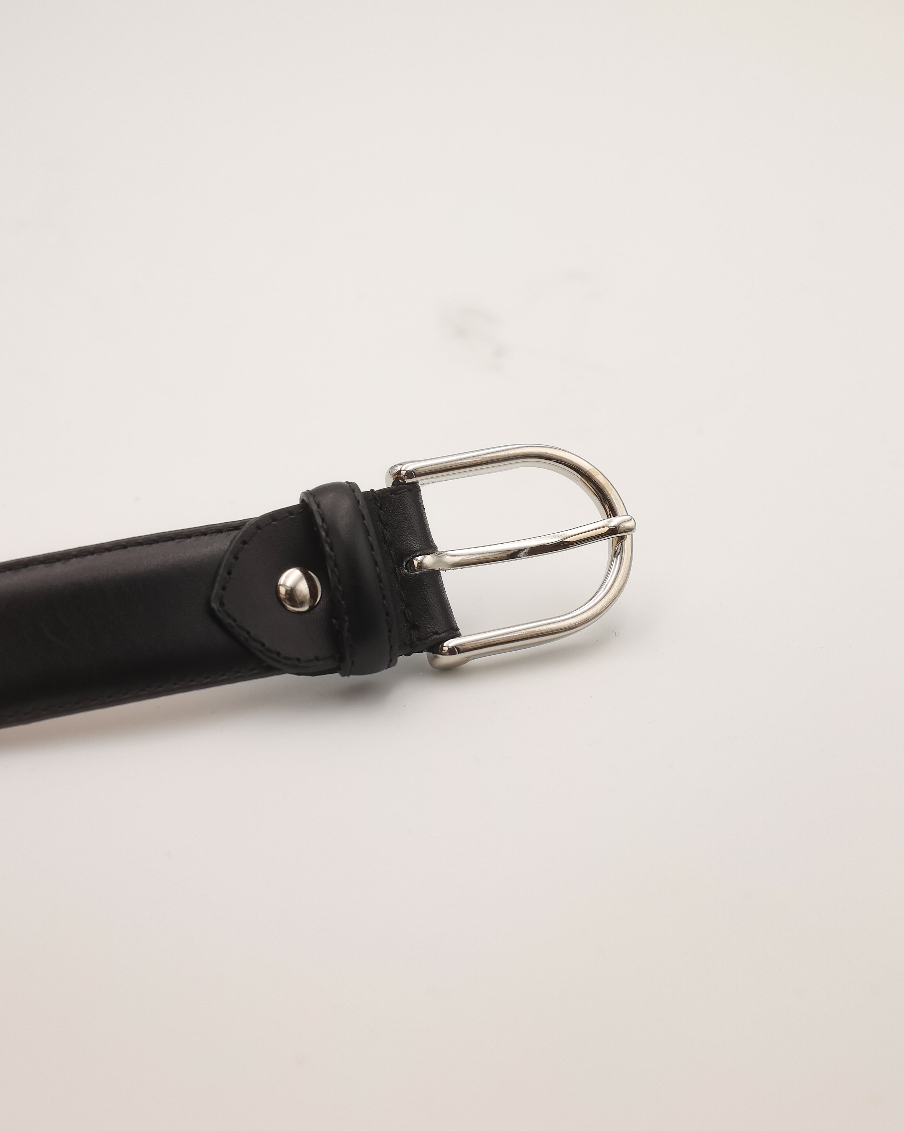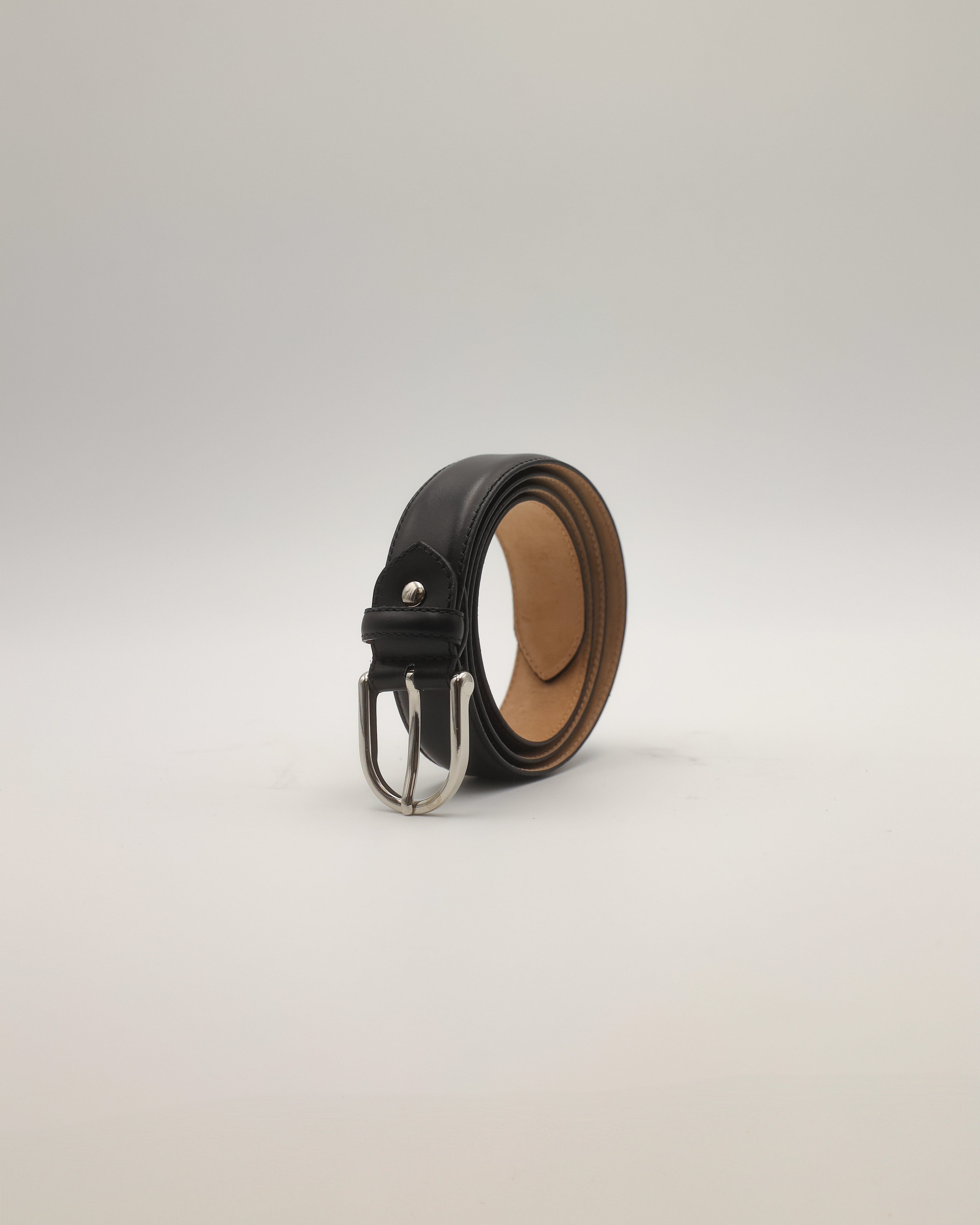 Handcrafted belt in black box calf leather, minimalist, elegant, and uncompromisingly high-quality. The fine stitching, polished silver buckle, and soft goatskin suede lining combine precision and comfort. A timeless accessory for every occasion.