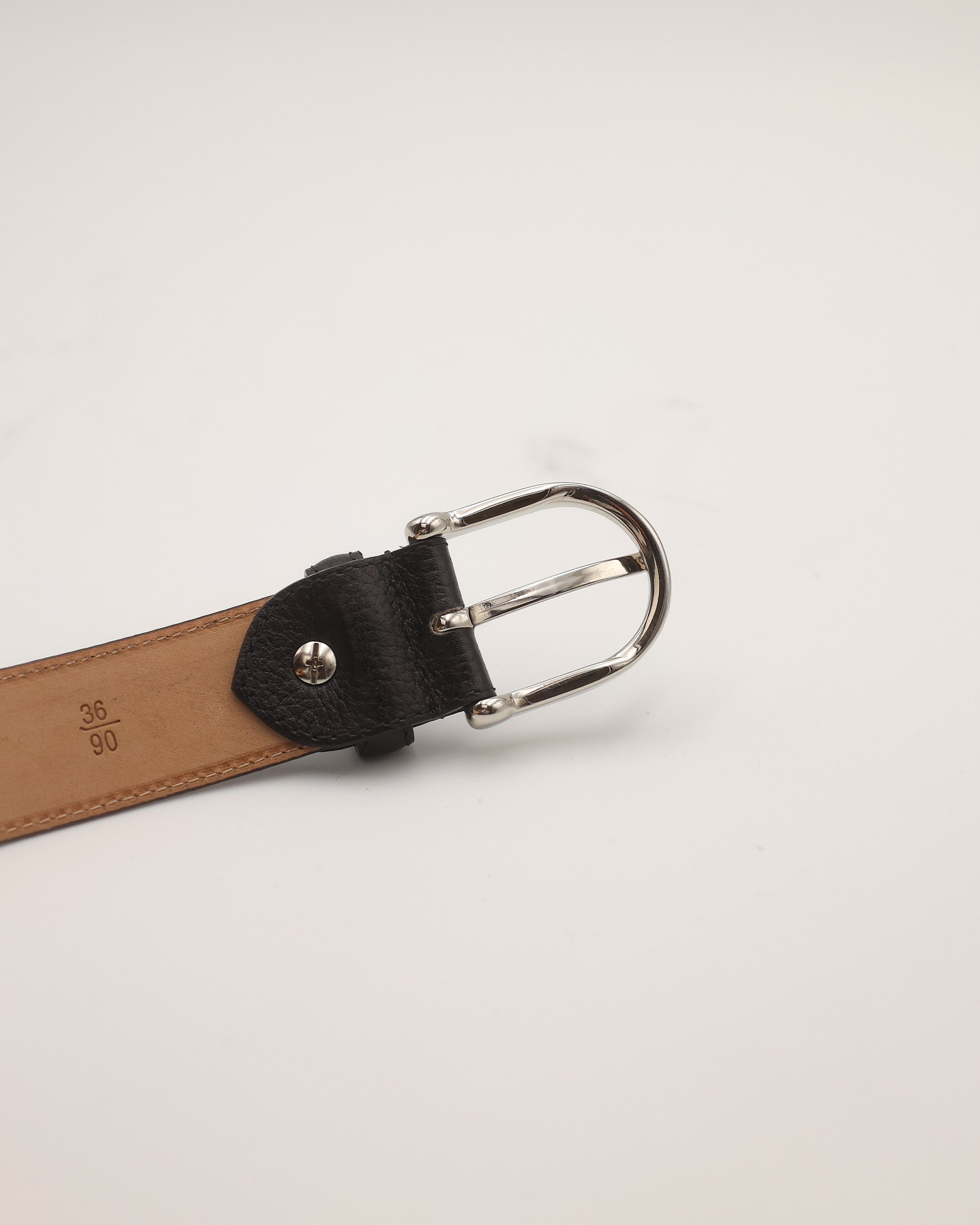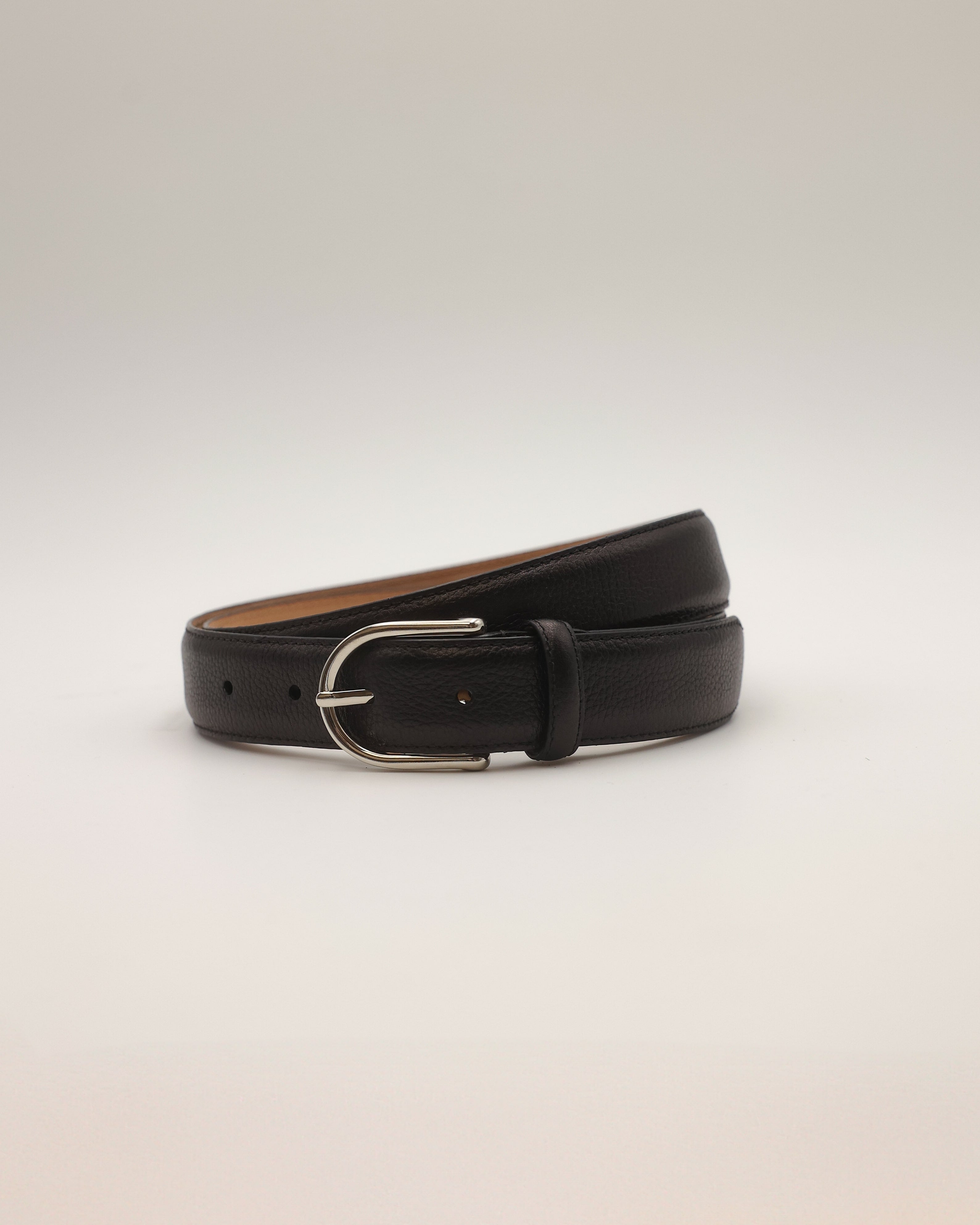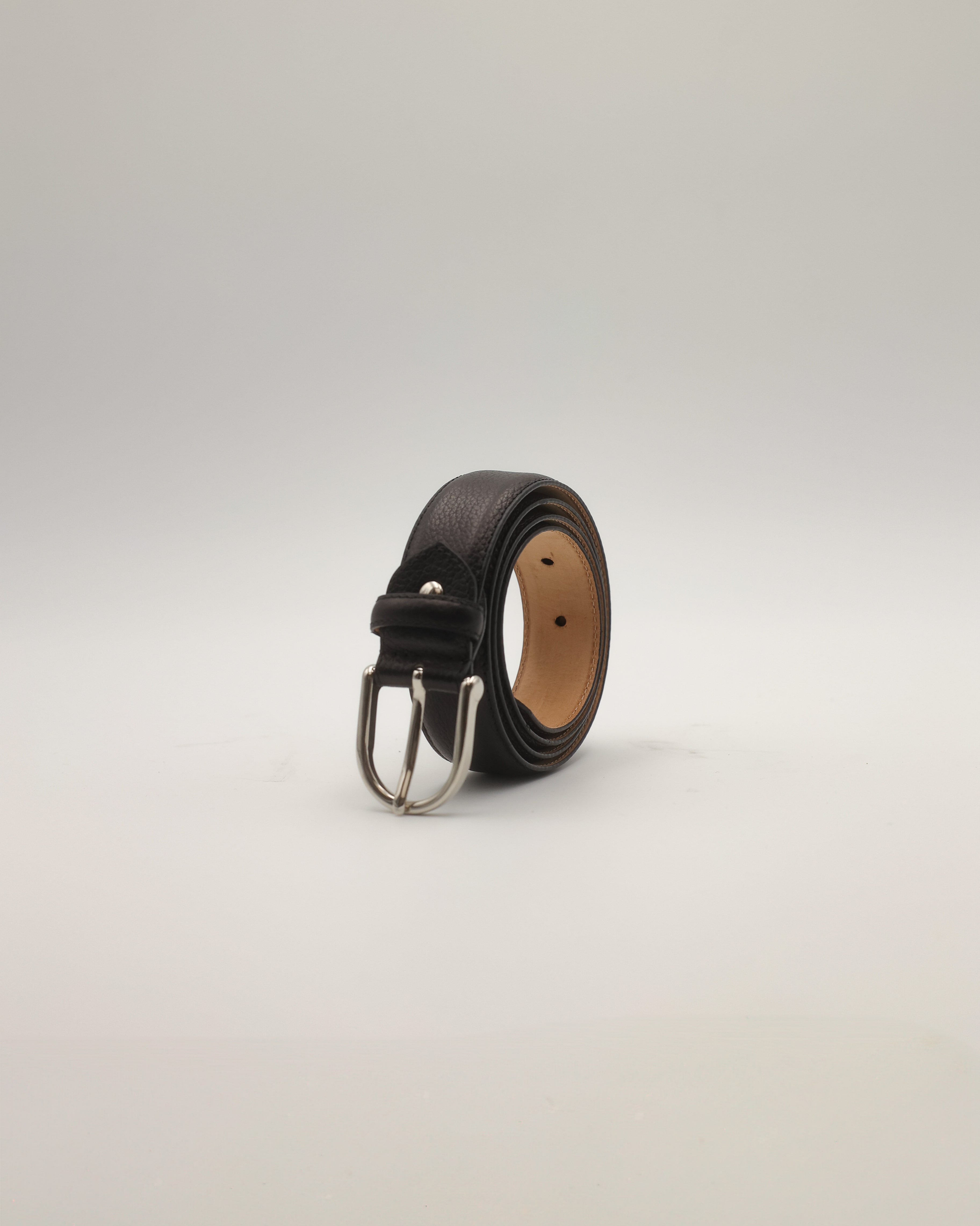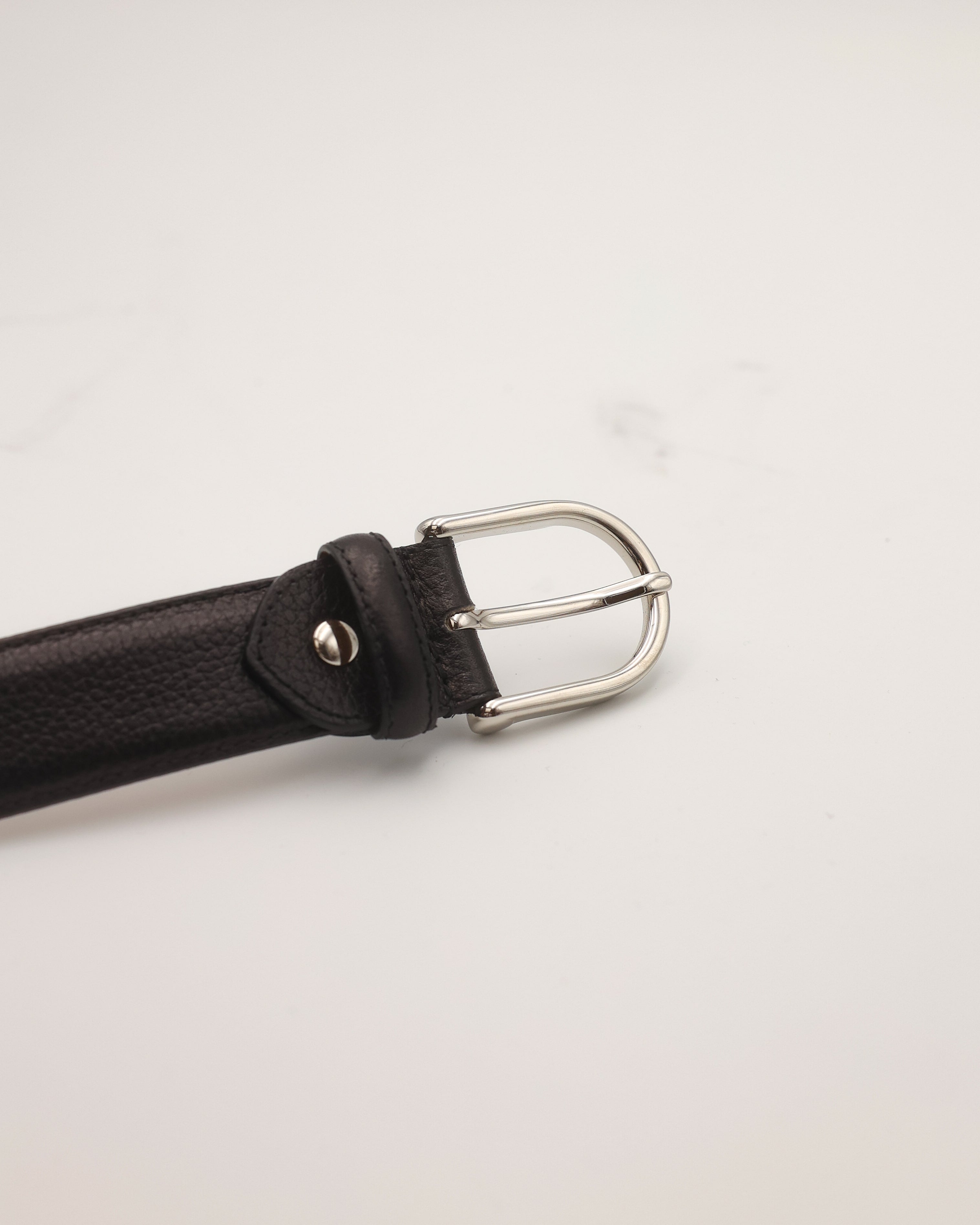 Handcrafted belt made of black full-grain leather – robust, elegant, and naturally textured. The finely crafted stitching, the sophisticated silver buckle, and the soft goatskin suede lining ensure style, comfort, and durability. A statement of classic craftsmanship.