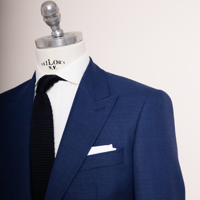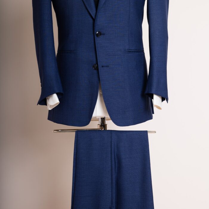 Azure Spirit steht für moderne Frische mit klassischem Anspruch. Der mittelblaue Anzug aus luftigem Fresco-Stoff vereint brillante Farbe mit strukturierter Leichtigkeit, ideal für wärmere Tage und formelle Anlässe mit Stil. Der edle, leicht melierte Stoff verleiht dem Anzug Tiefenwirkung, ohne aufdringlich zu wirken. Die schlanke Silhouette, gepaart mit weißen Hemden, dunklen Krawatten und einem Einstecktuch, ergibt einen Look, der sofort Präsenz zeigt – und dabei angenehm tragbar bleibt. Für Männer, die klare Statements setzen, mit einem Hauch nonchalanter Eleganz.