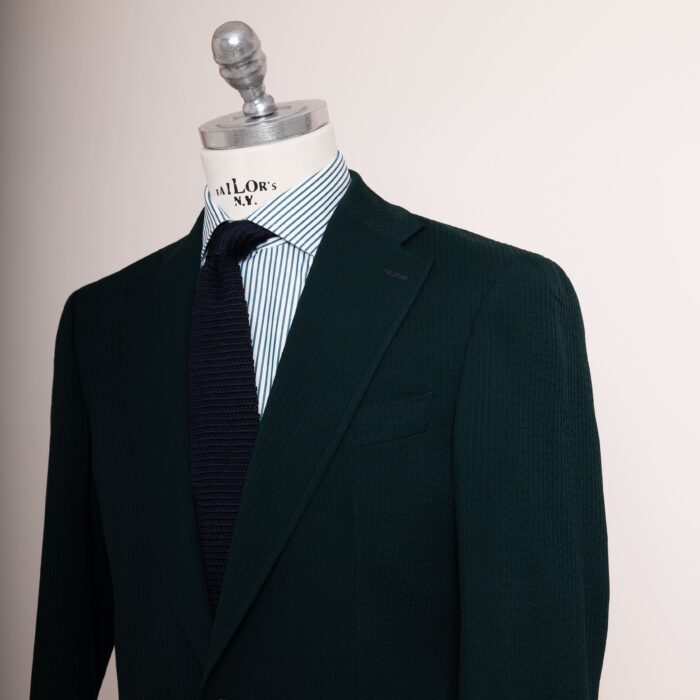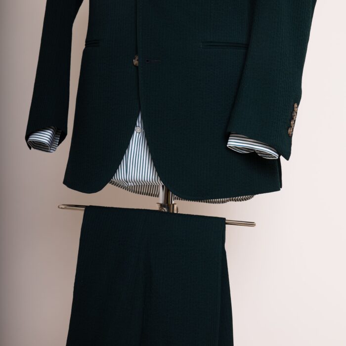 Business trifft Leichtigkeit: Verdant Executive ist der moderne Allrounder für anspruchsvolle Männer, die Wert auf Stil und Komfort legen. Gefertigt aus tiefgrünem Seersucker, vereint dieser Anzug klassische Eleganz mit sommerlicher Funktionalität – atmungsaktiv, knitterarm und souverän bei jedem Wetter. Die feine Struktur des Stoffes verleiht dem Look Tiefe, während das gestreifte Hemd und die dunkelblaue Krawatte für einen frischen, urbanen Kontrast sorgen. Ob im Büro, beim Kundentermin oder auf Reisen, dieser Anzug macht mit, ohne an Klasse zu verlieren. Für Macher mit Stil – leicht, lässig, leistungsbereit.